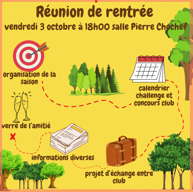 Venez nous retrouver pour echanger sur les projets du club sur cette nouvelle saison. Reunion suivie d'un verre de l'amitié. A vendredi.